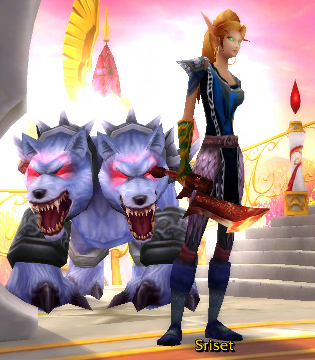 The first character I ever made in World of Warcraft was a female blood elf hunter I named Sriset. The name was one I’d created for one of my many fantasy novels and I figured it would be a name that wasn’t in much use. I was apparently right because I checked the armory before writing this and there are only two characters by that name: my level 120 hunter, and a level 54 blood elf hunter on the Aerie Peak realm, whose information isn’t accessible.