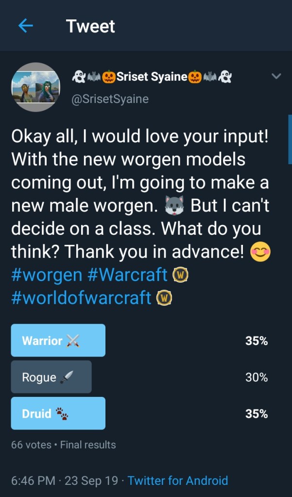 Unable to come to a decision on my own, I turned to Twitter and created a poll where people could vote on either warrior, rogue, or druid. I ran the poll for two days (I wish I’d only run it for one because the wait was killing me) and in the end, warrior and druid tied. Fortunately, a few people had commented that they’d voted for warrior and that broke the tie for me.