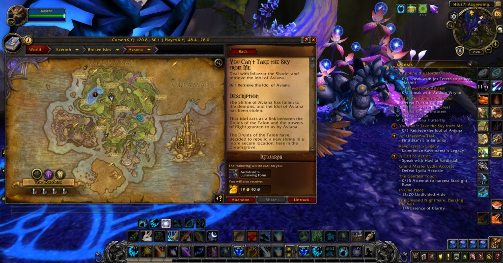 With that obstacle out of the way, I could finish up the druid campaign and make progress on the Breaching the Tomb achievement which would then unlock the quests for the druid class mount, the lovely Lunarwing. It took me a few days of questing through Legion because some of the quests were gated behind mission board quests and such, but at long last, the Lunarwing quest giver appeared to me on the Broken Shore.
