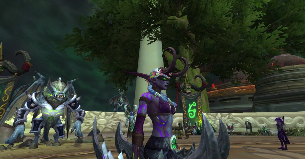 The morning of the planned afternoon event in Suramar on the realm of Suramar, I got Sverlara through the introductory quests and to Dalaran. I chose a mog for her that I thought worked well with her dark purple skin and topped it off with a permanent flower crown from the Lunar Festival.