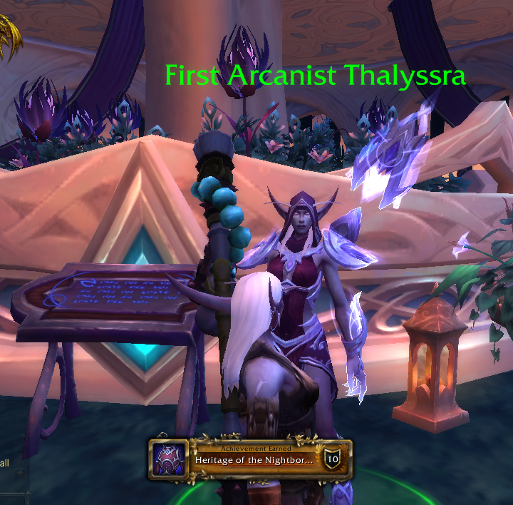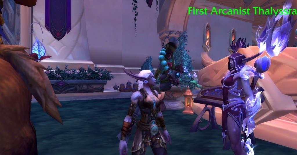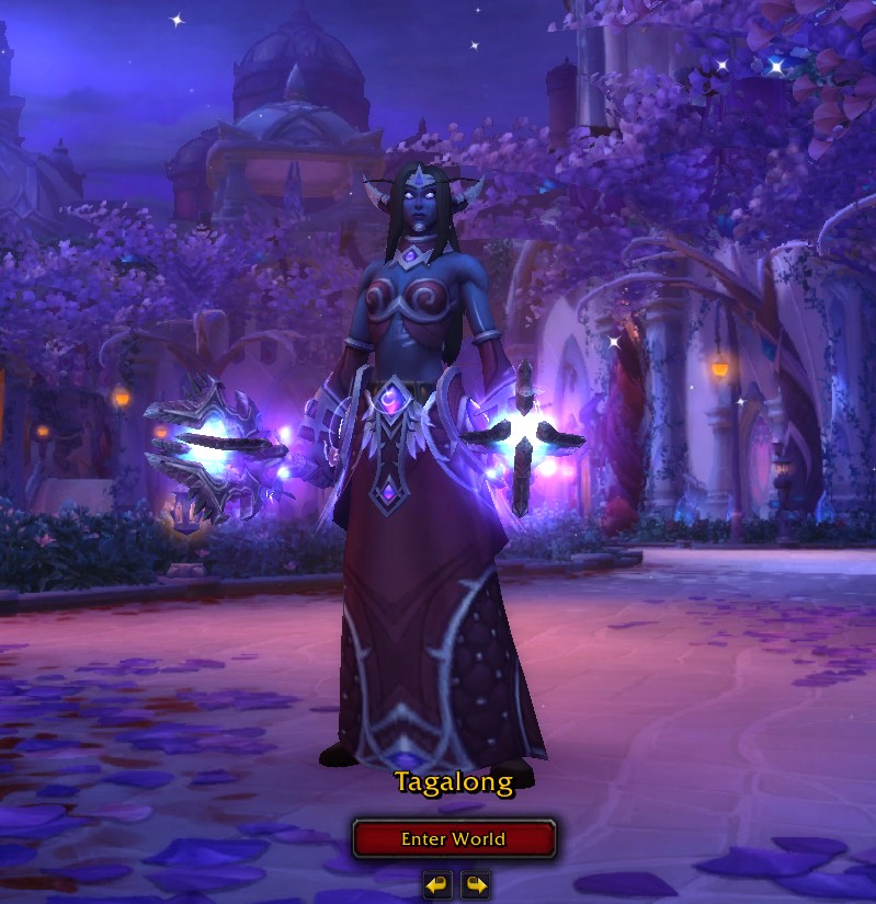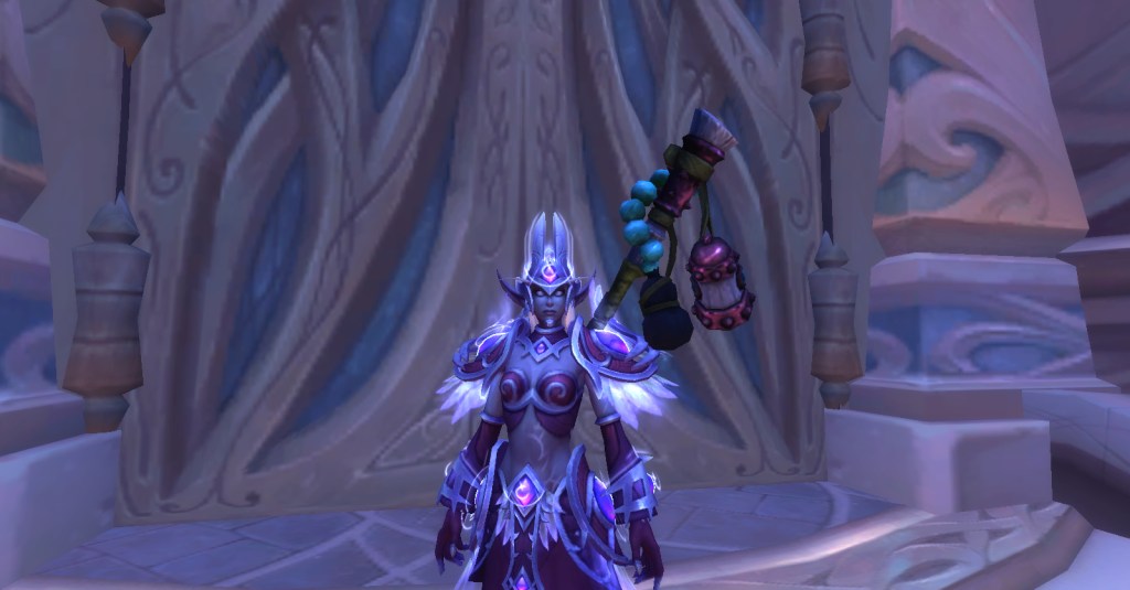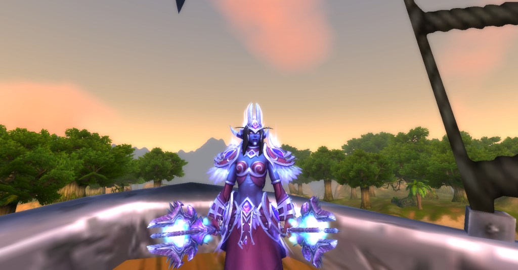 I felt the armor would suit my nightborne warrior Tagalong much better because I already had her wearing a plate skirt because I think it’s cool to kick butt in a skirt. I tried the armor on Tag and sure enough, it looked perfect on her!