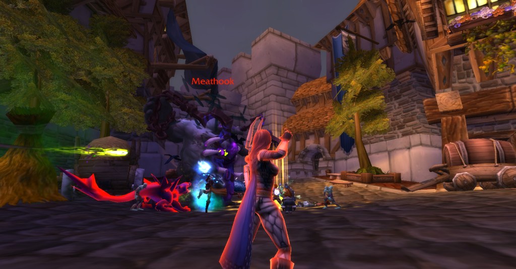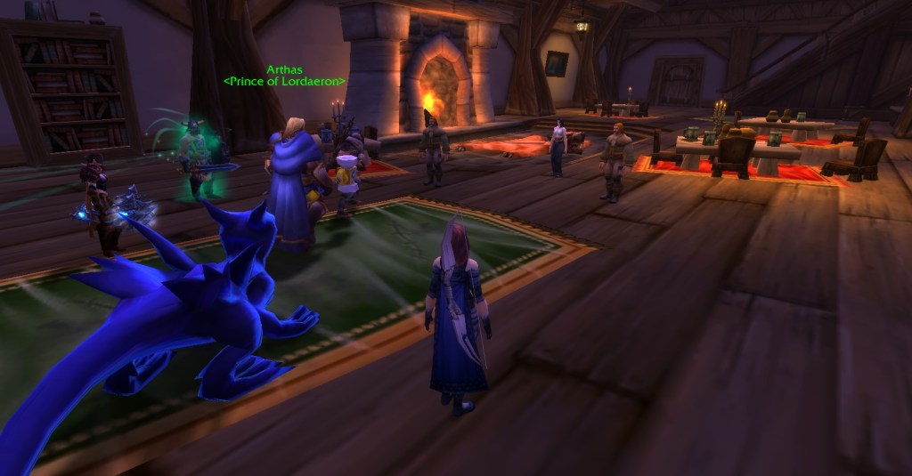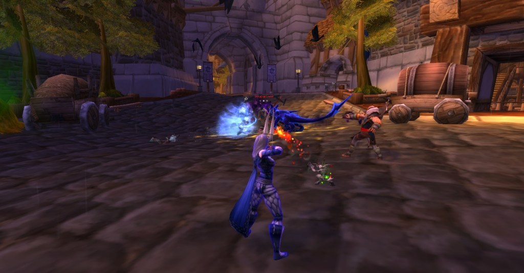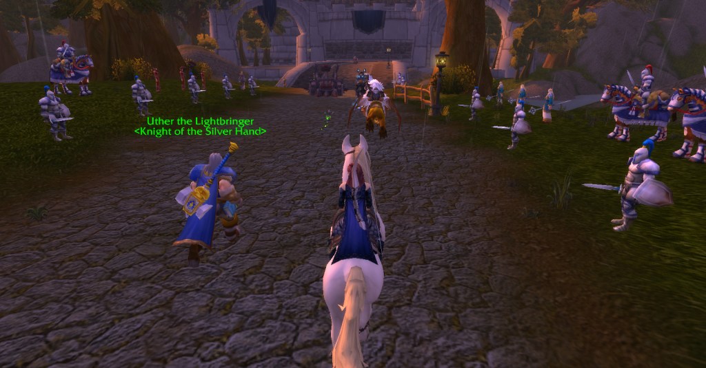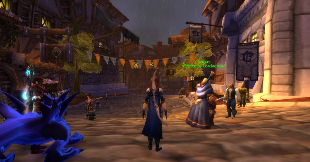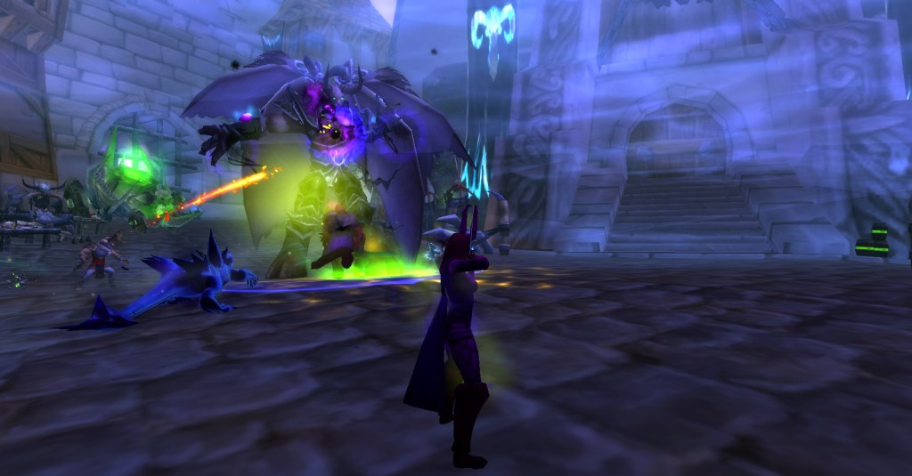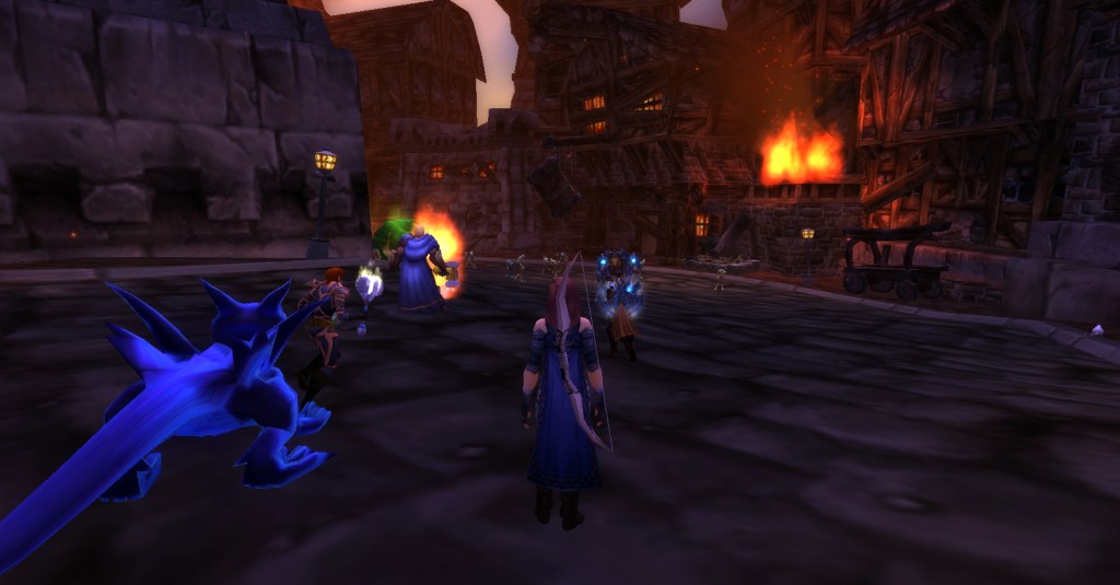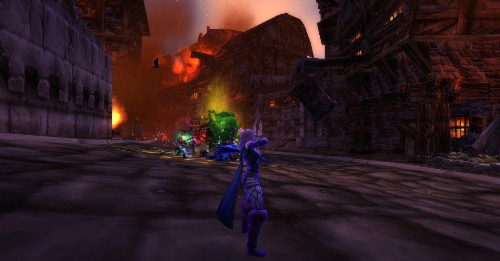 I imagine a lot of Warcraft players and Warcraft book readers know how the Culling of Stratholme happens, so I won’t retell it here with words. Instead, I’ll share my screenshots from my dungeon run that night. I was playing my void elf hunter, Val, but everyone gets turned into a human for this particular dungeon. In some of the pics my human hunter looks purple because the entropic embrace of void elves doesn’t agree with her skin tone. I really enjoyed the dungeon because it felt like I was stepping into a very familiar story and experiencing it firsthand. I’m going to run it with my oldest daughter sometime because she loves Arthas and all that lore even more than I do.