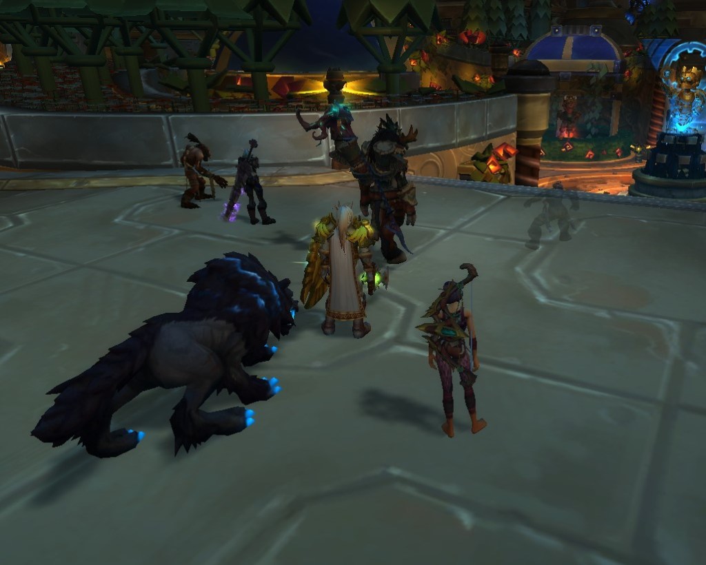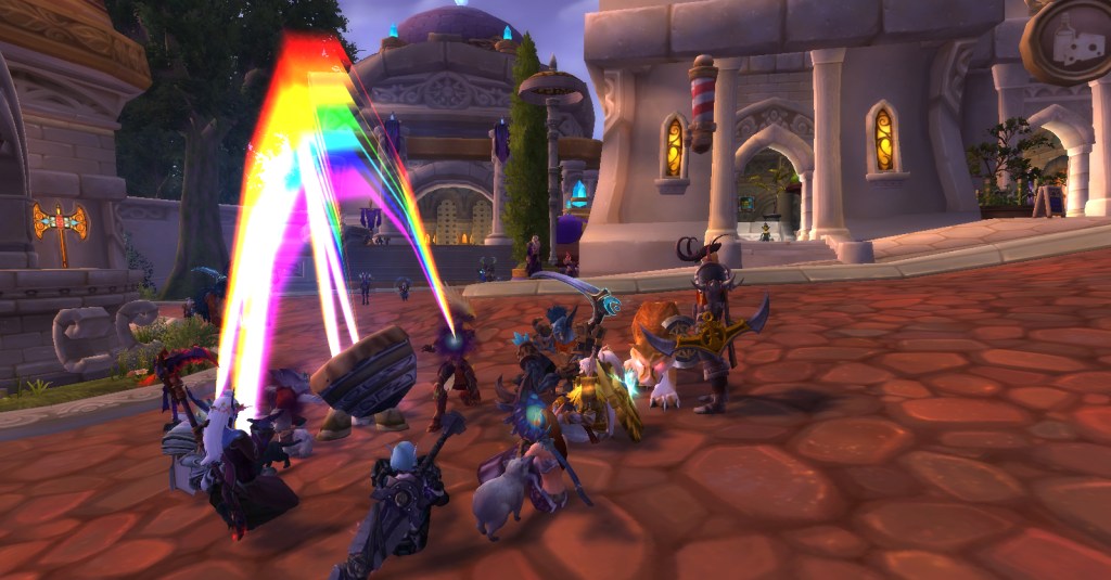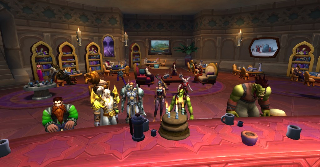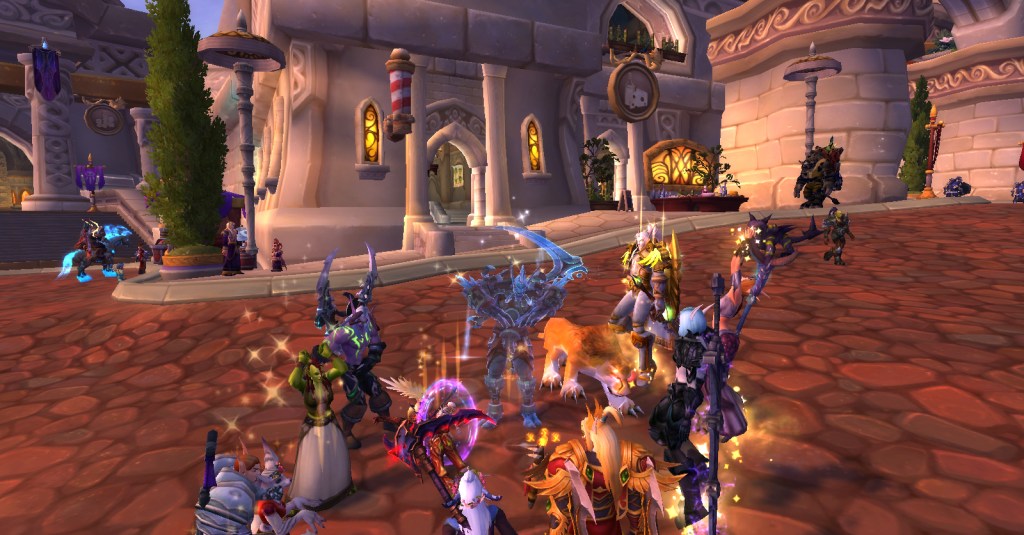 Fortunately for me, I’ve found great fellow Warcraft players through Twitter and we get together in game sometimes just to hang out or run a dungeon or clear invasions. One such Warcraft player was having a gathering in Dalaran yesterday evening to celebrate their birthday and it sounded like just the thing to lift my spirits and help me feel less alone and invisible. Turns out, I was right! We had a great time in Dalaran and earned the attention of many confused players who passed by.