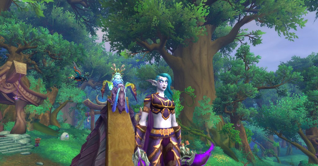 I played Syaine quite a bit in Legion and then for the beginning of Battle for Azeroth. But I stopped playing her much when I began focusing on getting characters ready for the Ny’alotha raid, which didn’t include any Alliance toons. I might play Syaine again someday, but for now she’s going to enjoy some rest and relaxation in Val’sharah with her nightborne priest mate Trehvos.