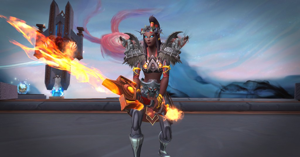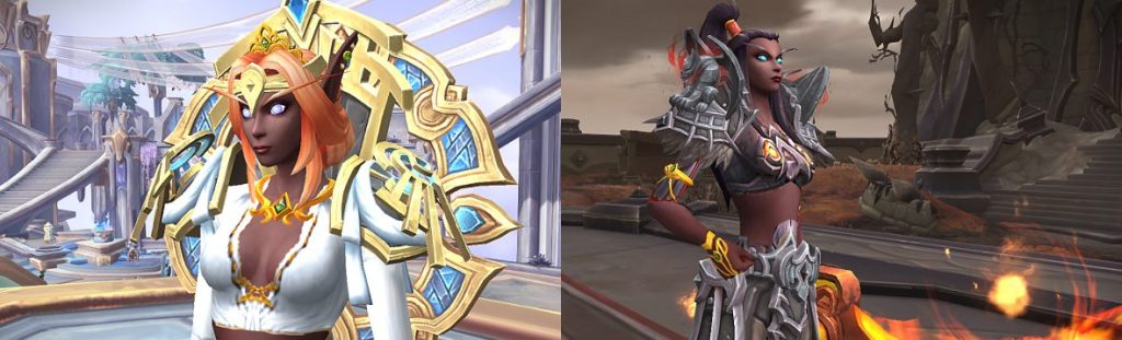 Now that Resora is separated from that fanfiction backstory due to me spending so much time playing her, my Warcraft world feels more cohesive. Unlike Nikara, whose appearance, seen in the previous image, changes gradually to something else due to her association with void elves, Resora always looked how she does with brown hair, blue eyes, and dark skin.