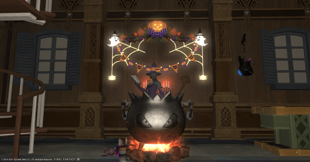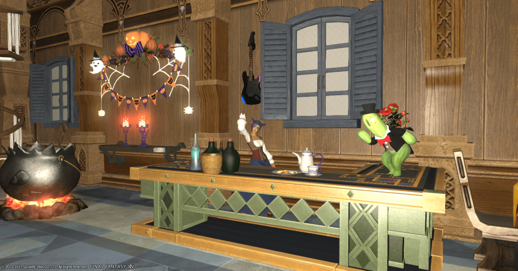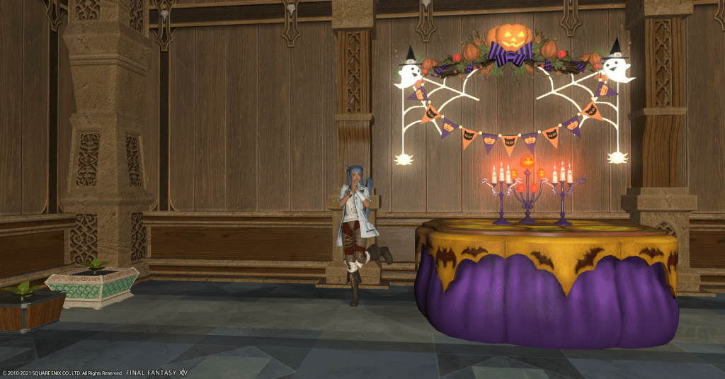 Although my biggest reason for getting an apartment was to color my chocobo, as soon as I had my apartment I discovered how much fun it was! I had some gil left over after buying the apartment to buy furnishings from the apartment vendor and I also bought some things from the online store. I was gifted a Halloween themed table to go along with the other Halloween decorations I’d purchased and it all just looked spooky and divine!