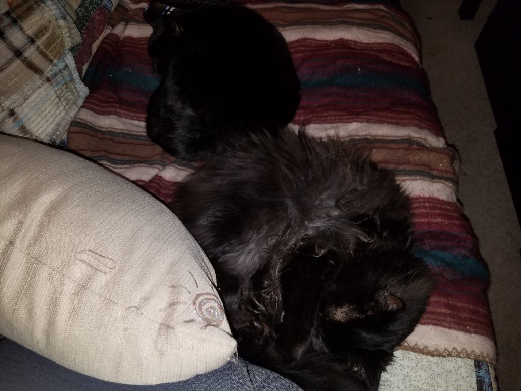 Owl wasn’t much of a cat “person” and she ended up bonding with my dog Jazzmin when I adopted her in the winter of 2012. She was determined that Jazz was going to like her no matter what and would go up to her and purr at her and rub against her until Jazz finally acquiesced and liked her. Owl is the reason Jazz was good with cats, she taught Jazz that kitties were her friends. Sadly, Jazzmin crossed the rainbow bridge at the end of March of this year. Her passing is actually what motivated me to create my goth bun Rajilo because I needed something new and different to distract myself and help me through the difficult time.