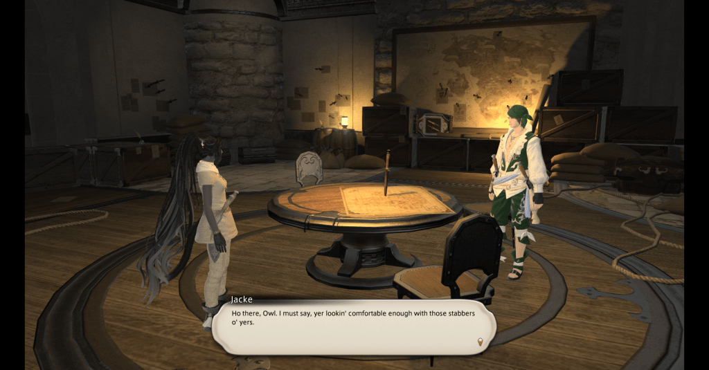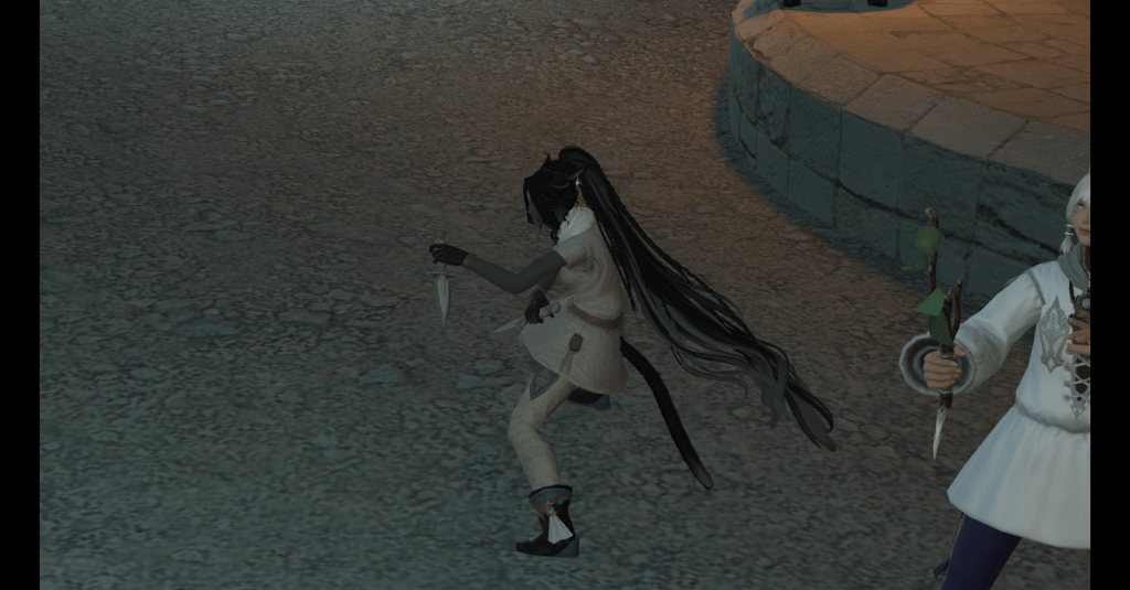 I did the best I could to capture Owl’s look and attitude in a Miqo’te woman and as I wanted to make her a rogue, I started her as a marauder so she’d be in Limsa and able to pick up the rogue quest when she completed the level 10 marauder quest. Seeing Owl Iboo swing a huge axe did sort of suit my cat Owl’s personality, but small, sharp daggers are definitely more her style.