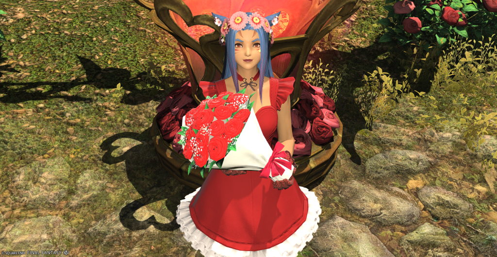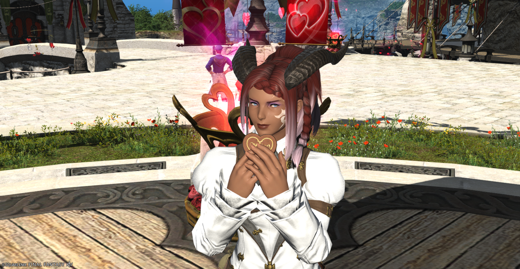 I made a couple Valentione’s themed glams for D’azri and Kibbles yesterday and I’m sure I’ll make more for other characters I play. I’ll be cranking out the Dalamud red dye on any characters I can for my own glams and to sell on the market board for others. There are many in-game decorations that aren’t obtainable though so I’ll just wander around and enjoy those as I can.