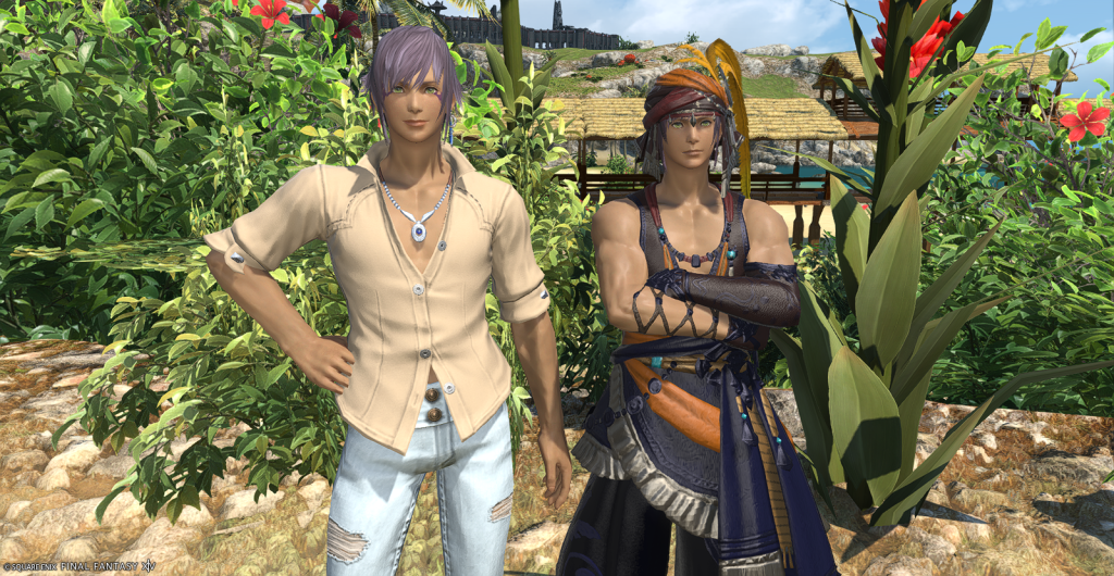 In the Pern books, Sharra is a healer who ends up marrying a young Lord named Jaxom. So of course I had to make Jaxom too! Jaxom Ruatha is a Midlander Hyur and I based his looks on one of the dancer NPCs named Kuihlud. Kuihlud is one of the musicians for the dance troupe and I’ve always thought he was a cutie. I couldn’t match the NPC appearance exactly because his face is customized to look a bit younger, but I got pretty close. Obviously Jaxom is taller than Kuihlud but as he’s not supposed to be an NPC copy anyway, I think that’s fine.
